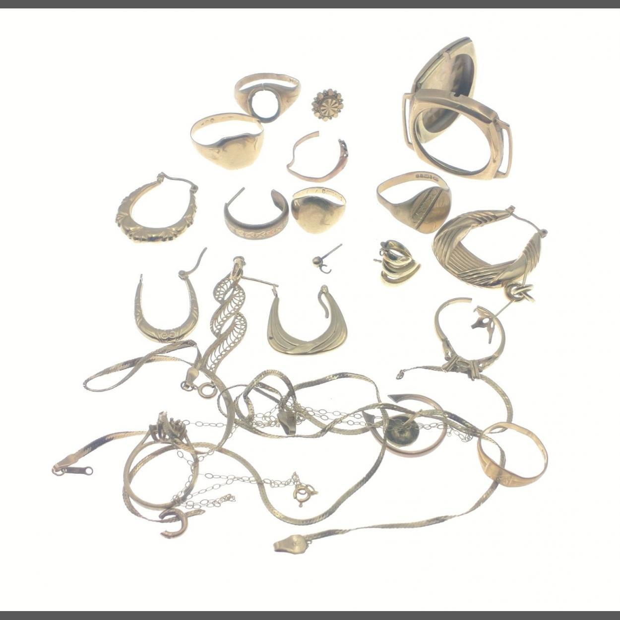 A great lot of scrap gold pieces to include watch case, rings, earrings. Total gross weight 32.7g approx