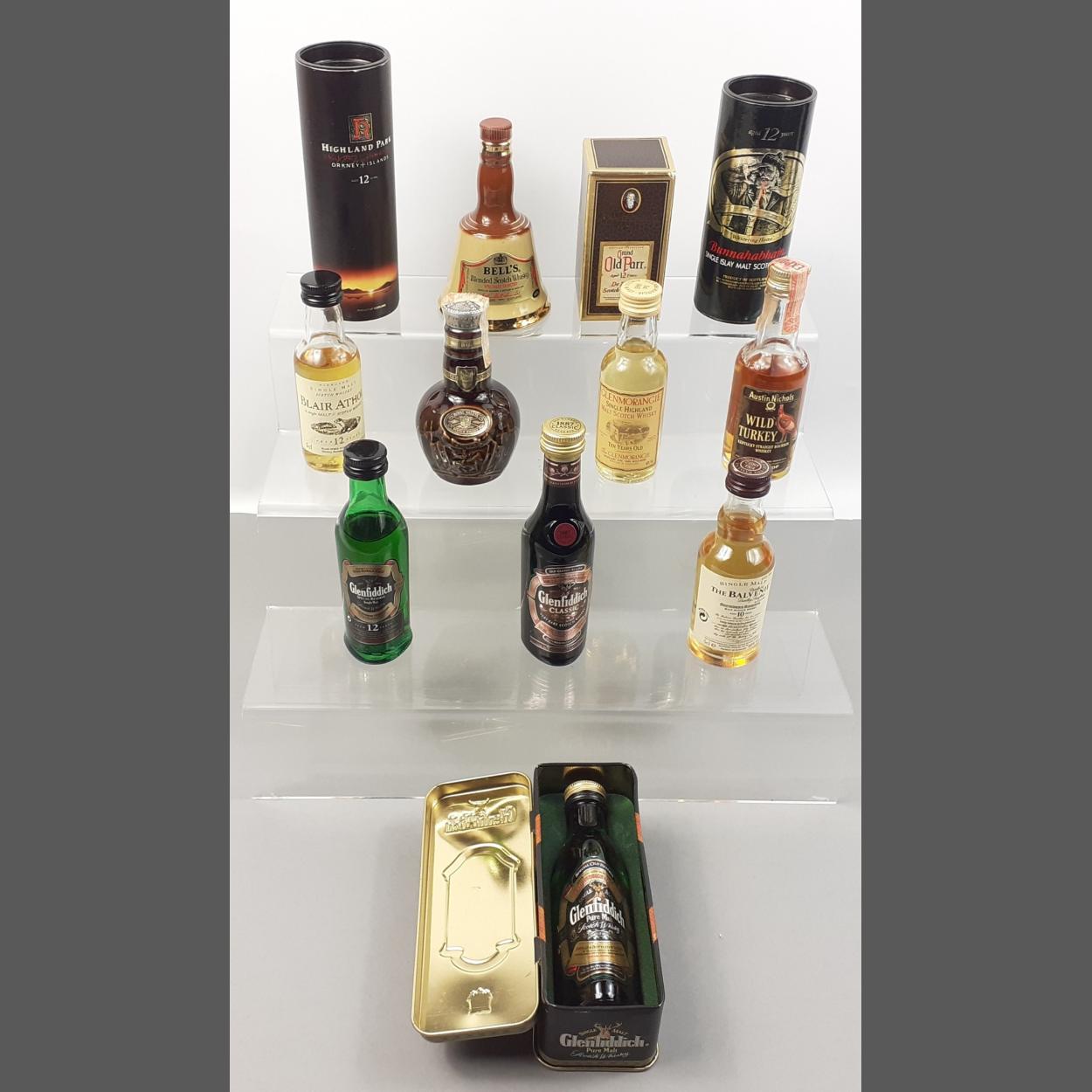 A small collection of 12 single malt whisky miniatures to include Bunnahabhain, Highland Park, Glenmorangie, Blair Atholl, The Balvenie, Glenfiddich, Glenfiddich Classic, plus Chivas Regal, Wild Turkey, Bell's