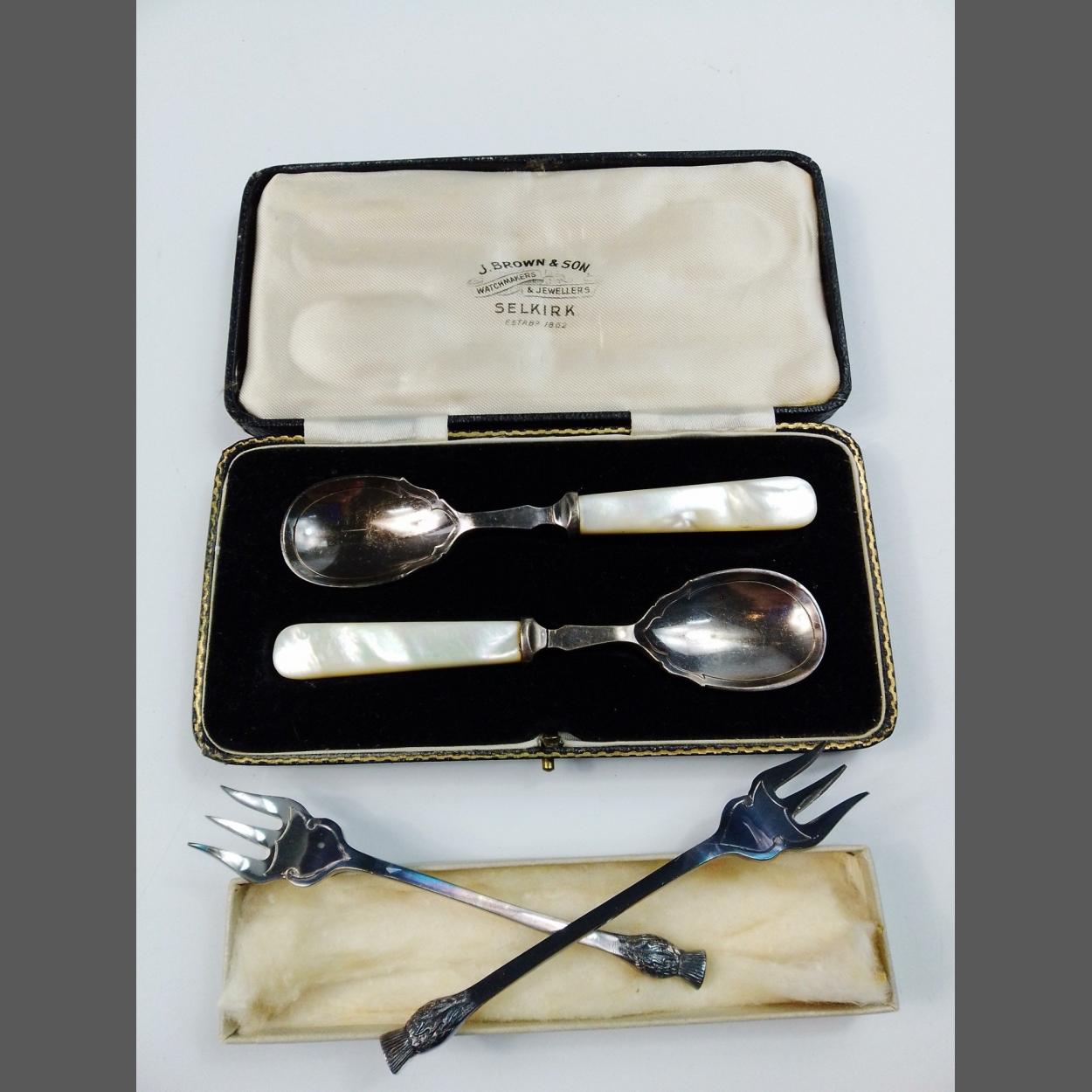 J Brown Jewellers of SELKIRK. A pretty pair of EP pickle forks with thistle finials in good condition and a boxed pair of spoons. Lovely Selkirk boxes and very pretty pieces.