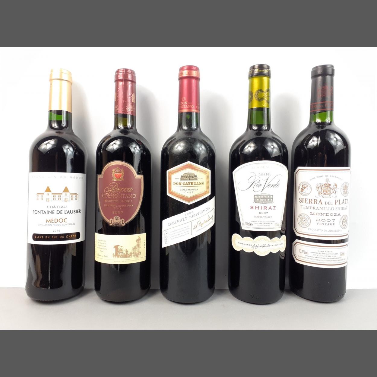 Five 750ml bottles of wine to include 2007 Sierra del Plata Tempranillo Shiraz, a 2008 Don Cayetano Cabernet Sauvignon, a 2007 Casa del Rio Verde Shiraz, a 2007 Rocca Colmontano Marche Rosso, and a 2016 Chateau Fontaine de L'Aubier Medoc