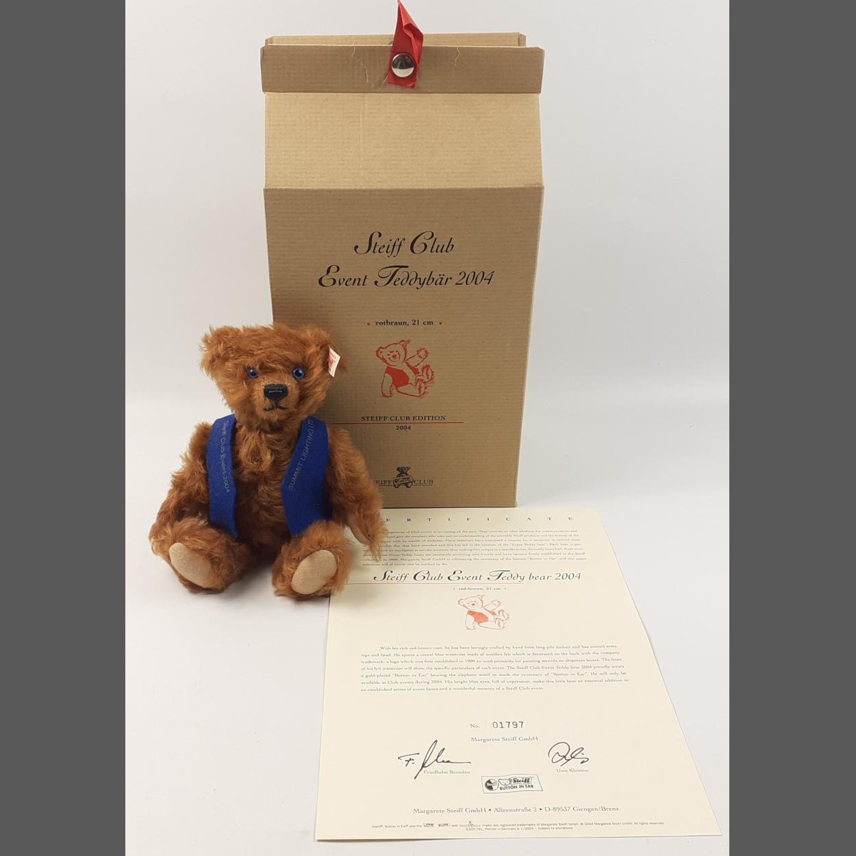 A STEIFF red/brown event bear from 2004, reference number 420443, with mohair fur, standing 21cm high, with certificate 01797 in original box