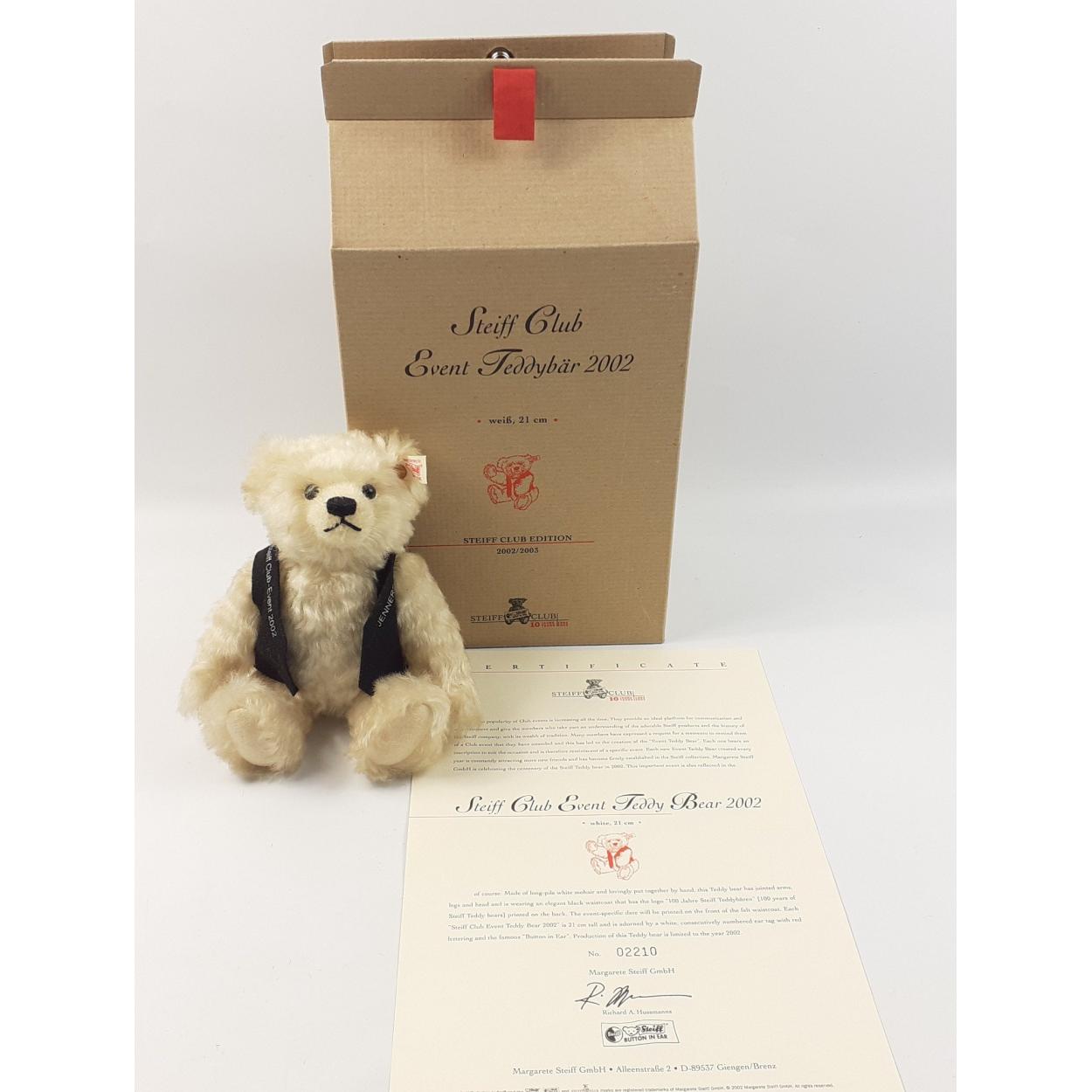 A STEIFF white event bear 2002 with JENNERS waistcoat, reference number 420337, stands 21cm tall, comes with certificate number 02210 in original box