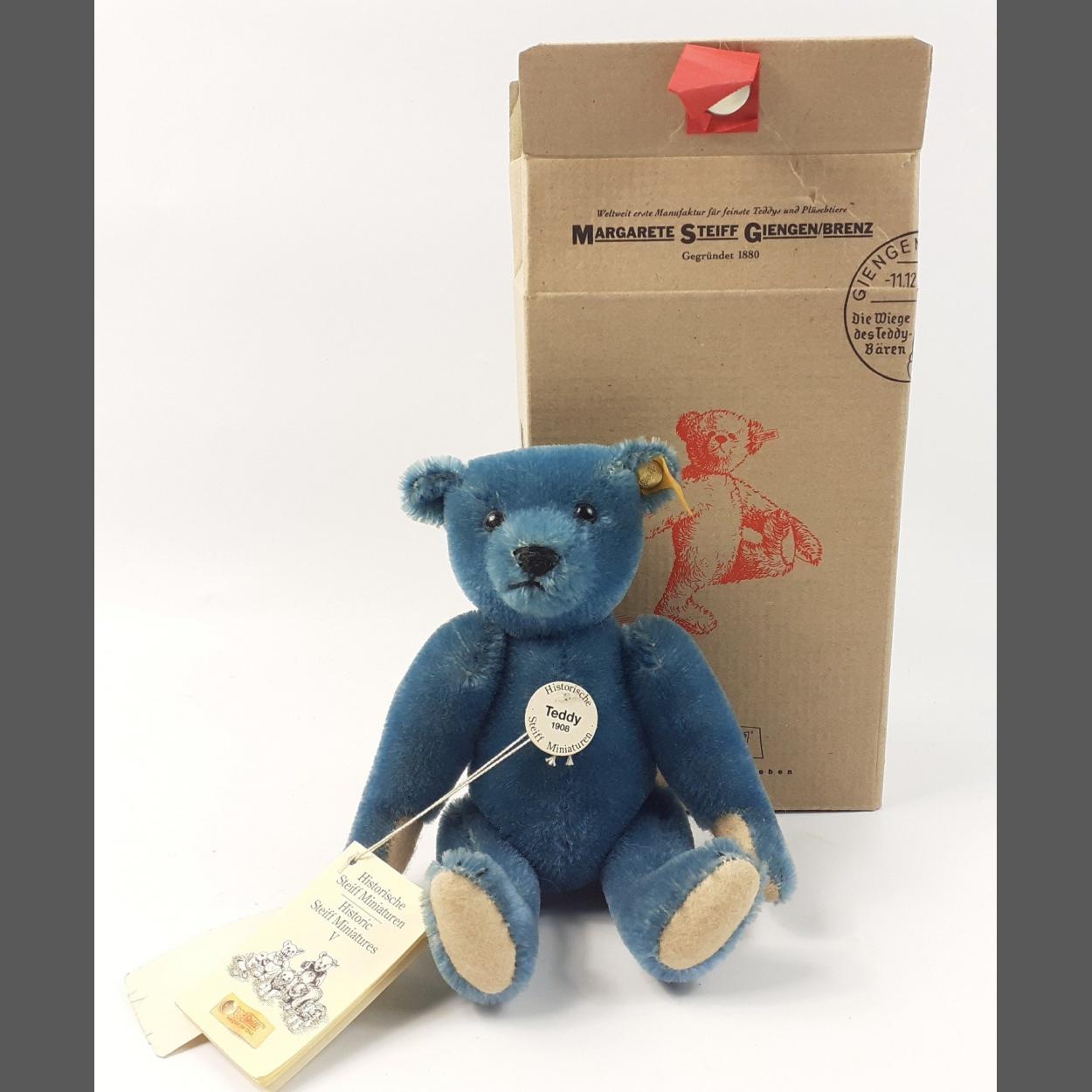A STEIFF historic miniature V 1908 teal coloured bear standing 18cm high, with labels