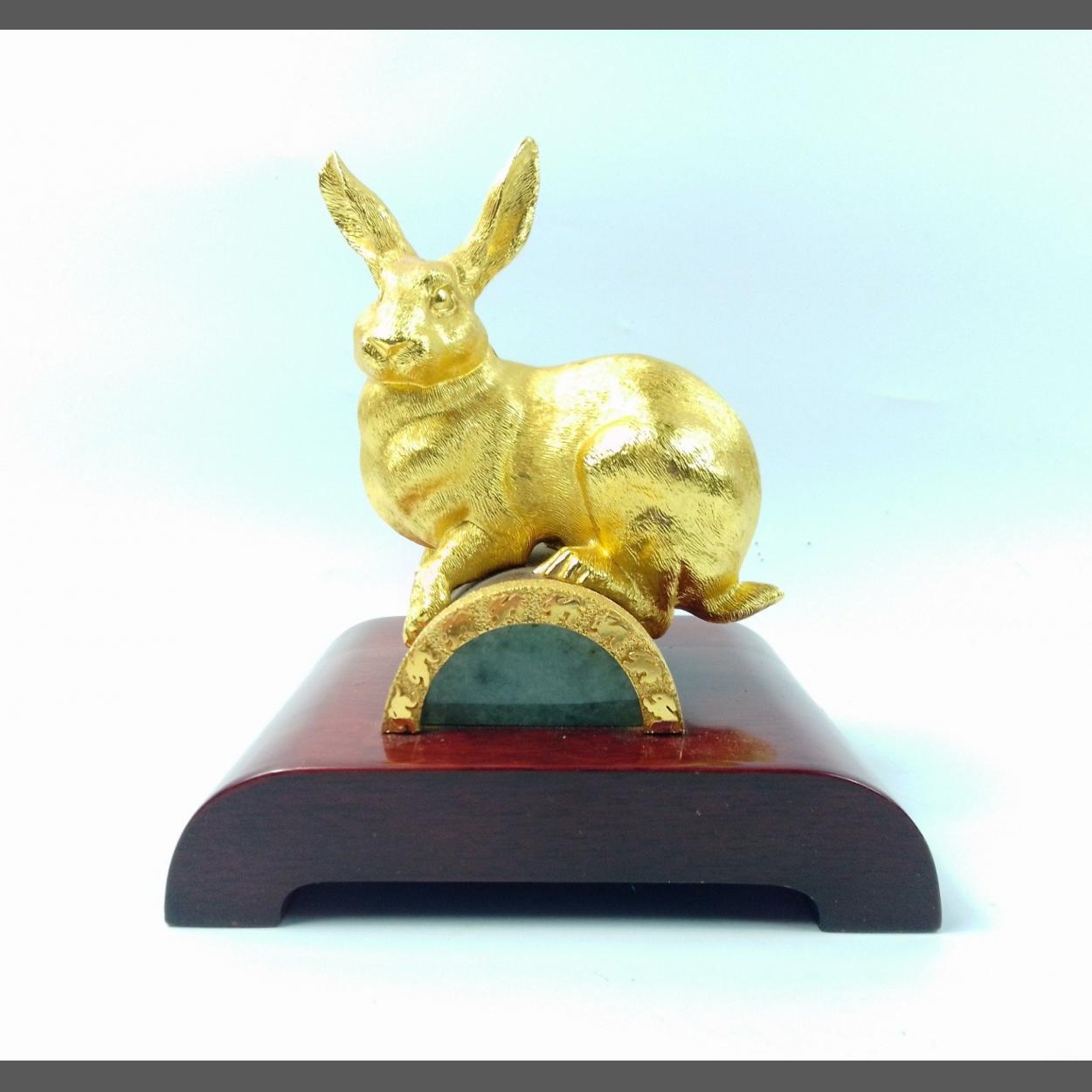 A highly detailed limited edition golden hare mounted on plinth 16cm across from Singaporean RISIS jeweller's shop