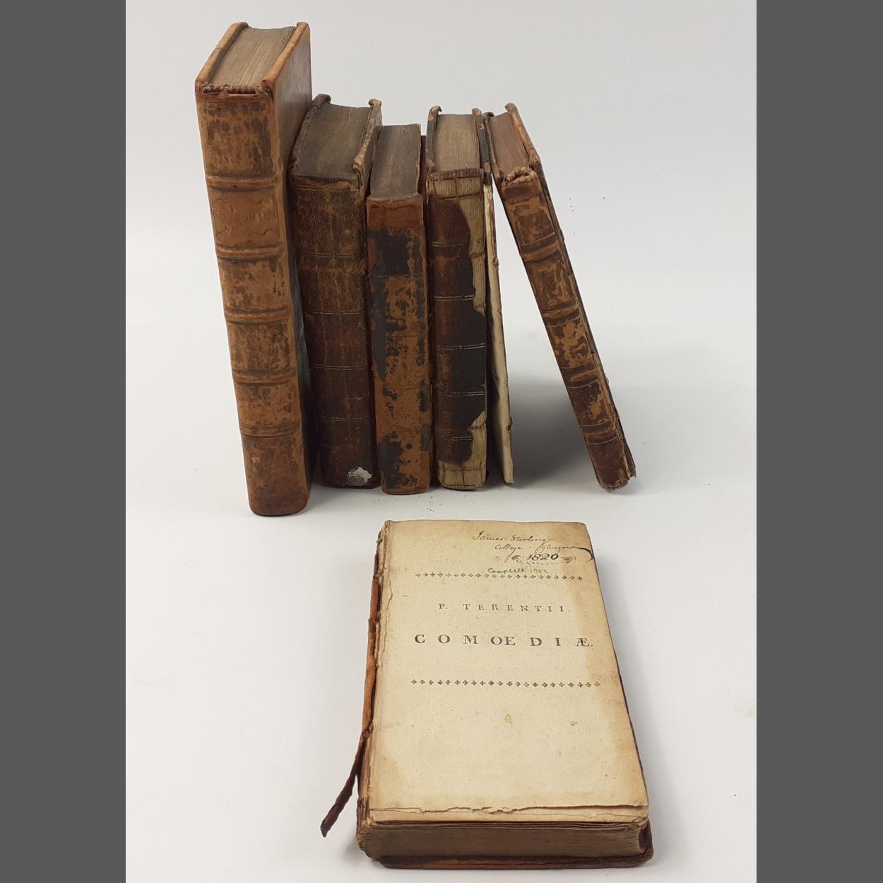 Antique leather bound books in Latin to include Publii Virgilii Maronis Bucolica, Georgica, et Aeneis published by BELL& BRADFUTE, Edinburgh 1812, two copies of Decerpta ex P Ovidii Naonis Metamorphoseon Libris by Ovid from the studio of Joannis Dymock, published in Glasgow in 1816 (front covers detached with possible smoke damage to one copy), M. VELLEII Paterculi Historiae Romanae Quae Supersunt published in London by Jacobi Tonson and Johannis Watts 1713 (Detached front) C. Suetonii Tranquilli XII Caesares es Optima Atque Accuratissima Francisci Oudendorpii editione published in Edinburgh by A Donaldson and J Reid in 1761, and also P Terentii Comoedie ad Fidem Optimorum Codicum printed in Edinburgh by Johannis Bell in 1775 (condition poor - front cover missing and early pages separated from spine)