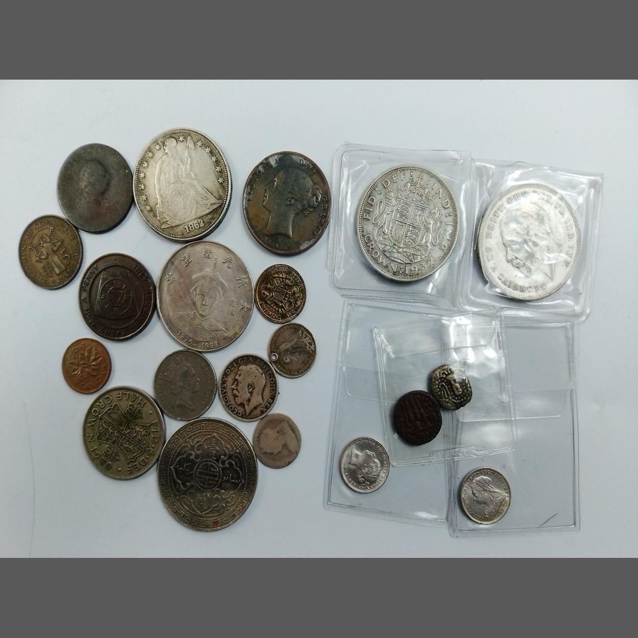 A good little lot of coins of numismatic interest to include three silver sixpences, a 1937 Crown, a 1935 Crown and others. Includes some restrike trade coins and a Masonic token.