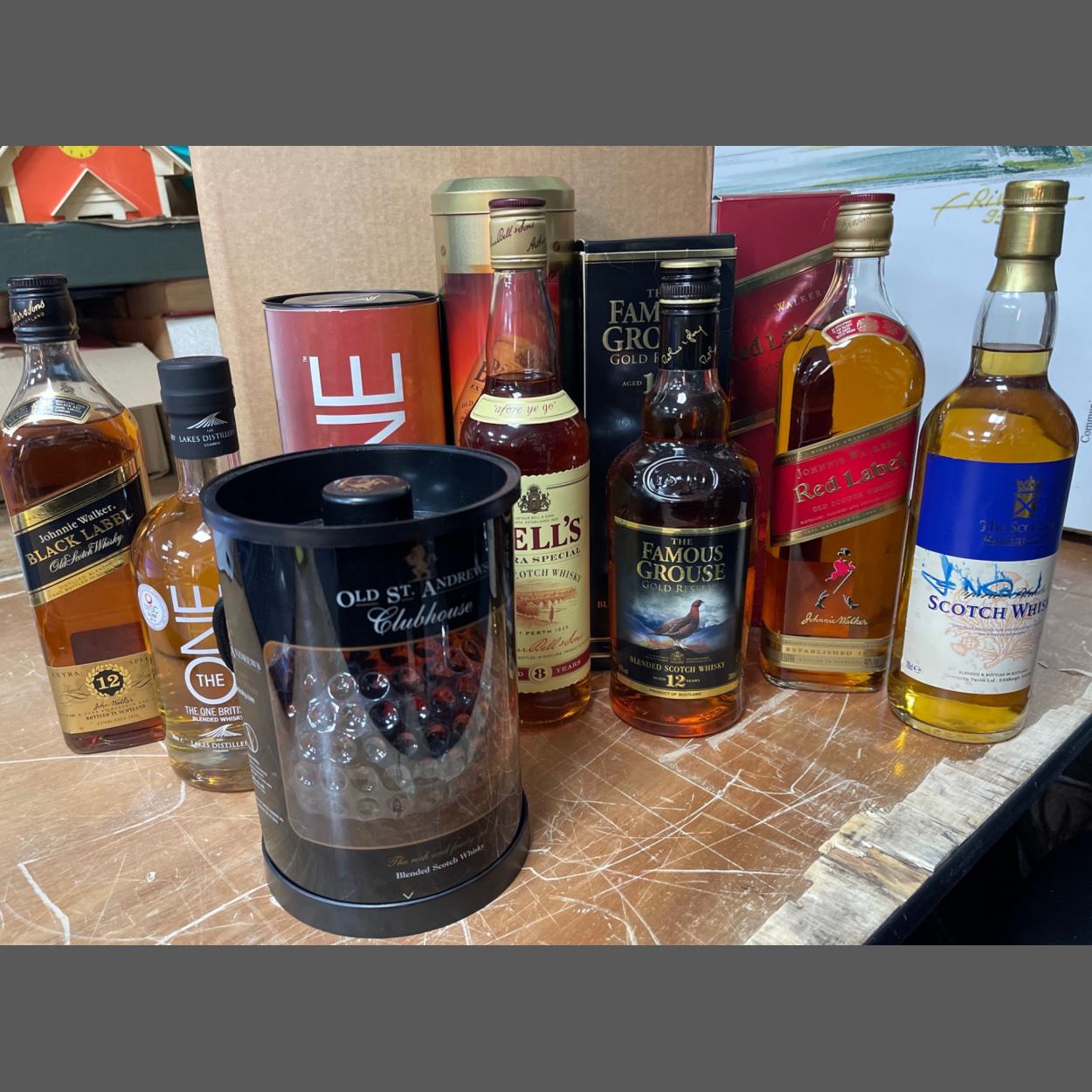 with also a signed HOUSES OF PARLIAMENT Scotch blended whisky 70cl politician personally signed (signature indistinct) with also a 700ml bottle of FAMOUS GROUSE GOLD RESERVE blended Scotch whisky with also a 70cl bottle of BELLS blended whisky aged 8 years and a bottle of JOHNNY WALKERS BLACK LABEL 12 years aged blended whisky 70cl (no carton)