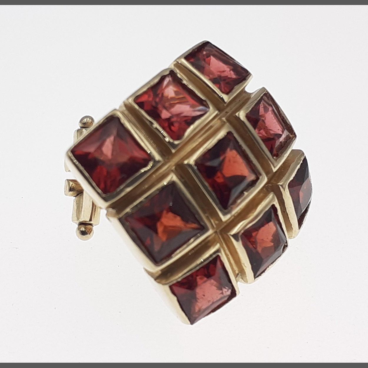 A QUALITY gold stamped 585 (14ct) single earring with 9 square cut garnet stones gross weight 6.22g approx