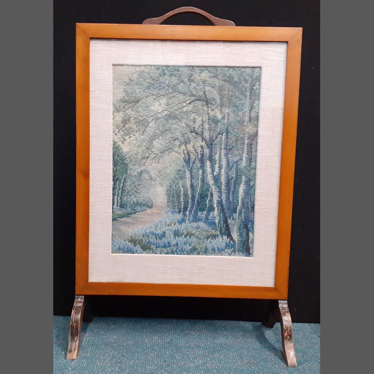 An embroidered and glazed fire screen. 86cm tall. Nice woolwork woodland scene.