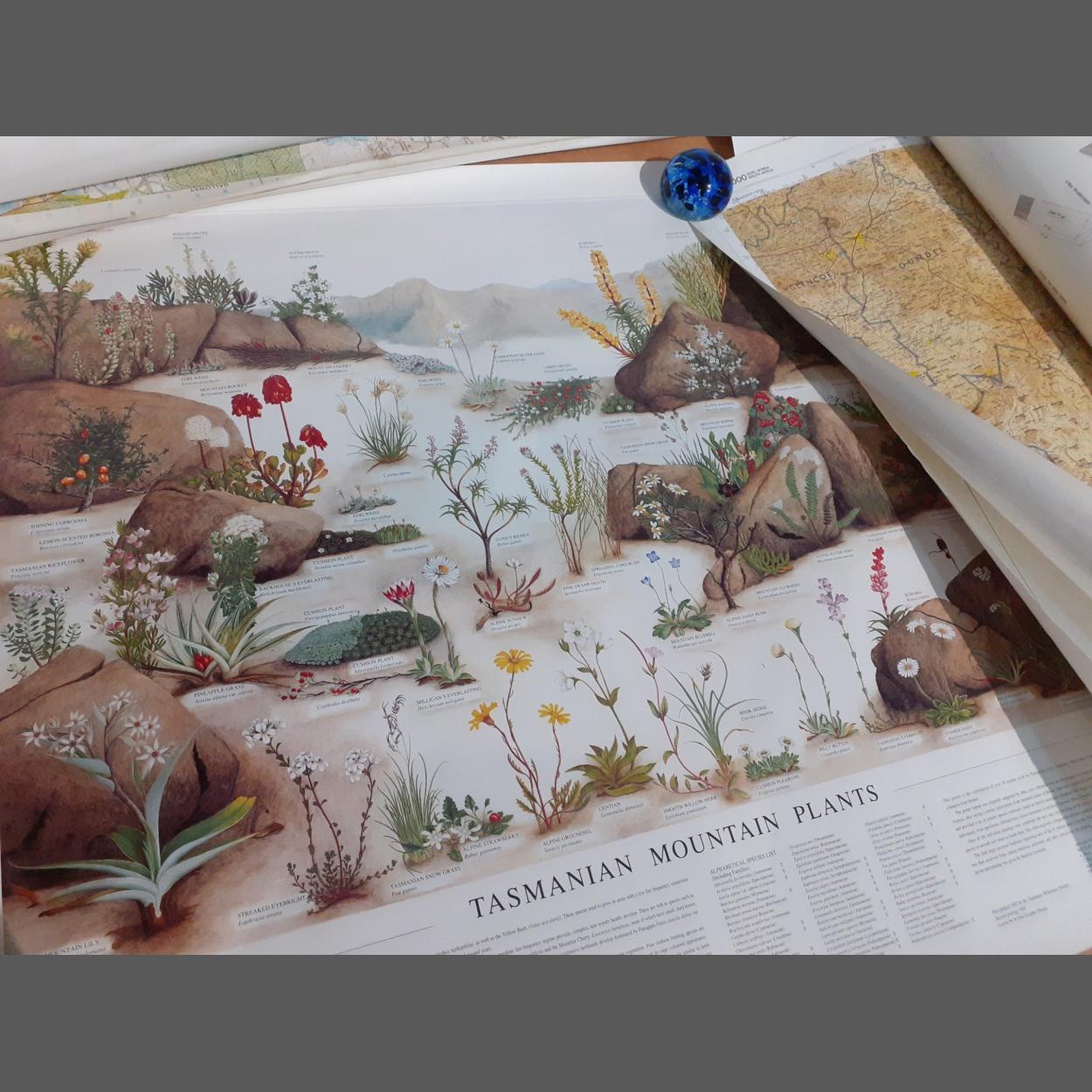 A quantity of ORDNANCE SURVEY rolled 1:50000 maps. Includes some laminated maps of South African interest and a wall chart of Tasmanian Mountain Plants.