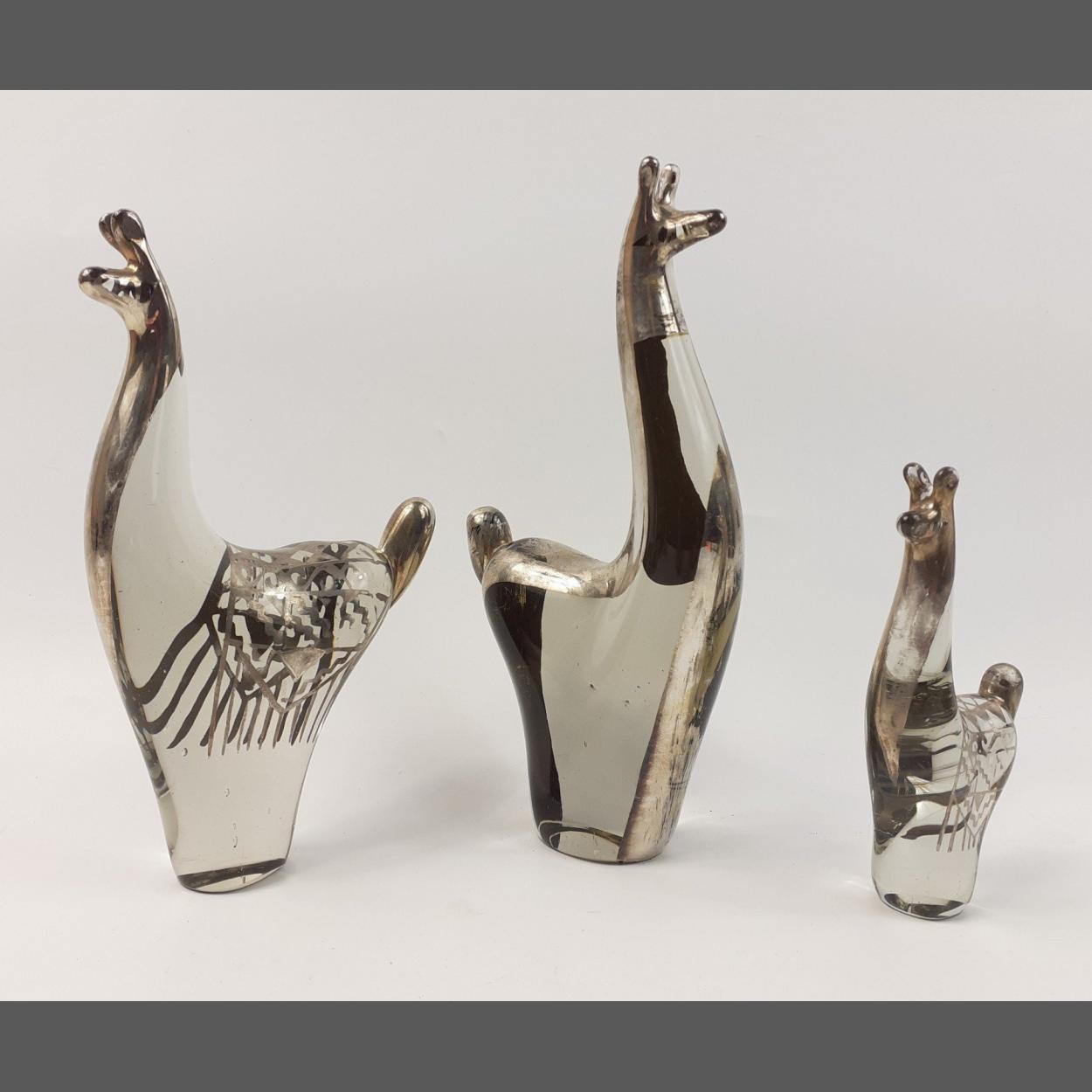 A family of three glass and silvered Llamas the tallest being 19cm. All in very good undamaged condition. A pretty little unusual group.