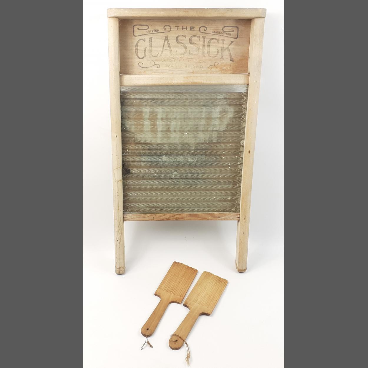 The GLASSICK washboard in good condition. 60cm tall approx. Includes a pair of butter pats.