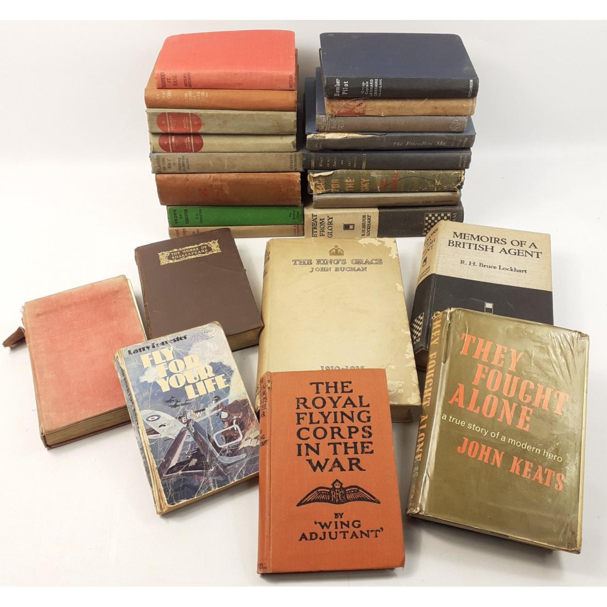 A box of books with many memoirs of war heroes including a first edition copy of REACH FOR THE SKY : DOUGLAS BADER His Life Story published in 1954. Dust jacket condition fair, owner's inscription. Also THE ROYAL CORPS IN THE WAR by 'Wing Adjutant', BOMBER PILOT by Group-Captain Leonard Cheshire VC, DSO, DFC, MEMOIRS OF A BRITISH AGENT by RH Bruce Lockhart, TOMMY OF THE TANKS by Escott Lynn, and others
