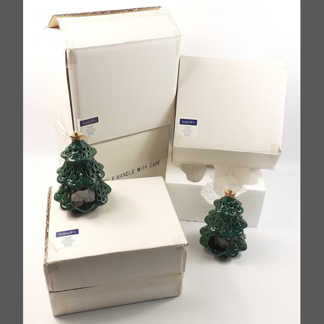 CHRISTMAS IS HERE! Four boxes containing eight ceramic Christmas Tree tea light holders.