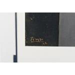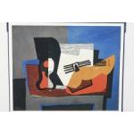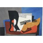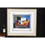 A rare framed limited edition by Pablo Picasso titled "Still Life with Guitar, 1922". This piece is one of only 75 published worldwide. The quality of this print is superb and in excellent condition. It is beautifully framed in an expensive hand made frame with art mount. Complete with a certificate of authenticity signed by the "Master Printer". It will be supplied with an replacement valuation certificate for £2000 (free of charge). Each print in this edition has been hand sorted and fully inspected by the Master Printer. This high quality edition was published on acid-free calcium carbonate-buffered stock paper, mould-made made from 100% cotton and printed with light fast inks. Picasso did not like musical instruments particularly, and nor did he play one. Yet despite this distaste, instruments, and in particular the guitar which became a favourite cipher, are among his most regular subjects. By the beginning of the 20th century the apparently faithful recording Jens of photography made realist painting feel redundant to many artists. Searching for a new methodology Picasso and Georges Braque experimented with a means of translating what they saw into a unique and personal visual language. They combined what became the Cubist movement with a shift away from the usual subjects of traditional Salon paintings such as landscapes and elevated portraiture to simple still life's redolent of daily life. By restricting the eye to a group of objects, Picasso and Braque embarked on a tightly focused dialogue together. These still lifes, with flourishes of words and newsprint and often reusing objects such as: a stringed instrument, a glass, or a spoon, were fresh on Picasso's mind when, he moved beyond the Neoclassicism of the post-war 'rappel a l'ordre' and began to reinvent his Cubist style. As he returned repeatedly to the guitar as a subject, certain elements shift and start to take on a life of their own. This painting gives a glimpse of the next phase of Picasso's ever-changing genius, with the composition presenting an inherent sense of playfulness in their manipulation of the object. This notion was explored increasingly in the mid 1920s and later as the artist began to explore surrealism more intently, and evolved the extraordinary sequence of near metamorphic bathers.
