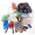 A collection of turned polished stone pendants. Pretty stones wapped in metal wire mounted as pendants. Approx 10 stones.