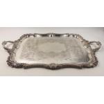 A huge and heavy BARKER ELLIS England silver plated salver in very heavy gauge plate. Beautifully elaborate edging and displays magnificently. A stunning piece. 61cm long approx