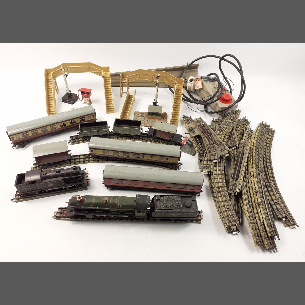 A super vintage MODEL RAILWAY OO HORNBY DUBLO locos, rolling stock and layout pieces. Includes steel bodied 69567 tank loco, 7013 BRISTOL CASTLE with tender, three pressed steel carriages and lots more. Includes a nice lot of Dublo triple rail solid track. Some great pieces, has been used but appears complete.