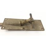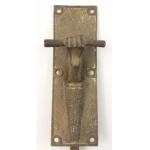 A vintage brass bell pull with plate and antique pull in shape of clutch and bar. Plate measures 20x7cm