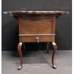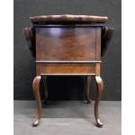 A beautiful wooden sewing storage box, appears Edwardian with RD757105 registration mark. Much sewing paraphernalia set into the lid, lower drawer with lock and key with contents including buttons and threads