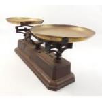 A set of balance scales with 2 x 20cm brass pans marked FORCE 5 KILOG, 40cm at base