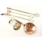 A mixed metalware lot to include a 40cm brass wall tray with fleur-de-lys design, 3 toasting forks and a copper skimmer and a Victorian crown brass epaulette