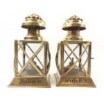 A pair of decorative brass storm lanterns, glass intact and with wicks, each standing approx 26cm high.