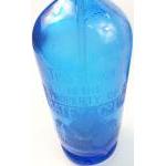 Four traditional soda syphons including VICTORIA WINE, SMITH'S of Milton Bridge, and 2 BATEY & CO. There is a crack on the inside of the blue Batey's bottle. Each offers a 1/- deposit return