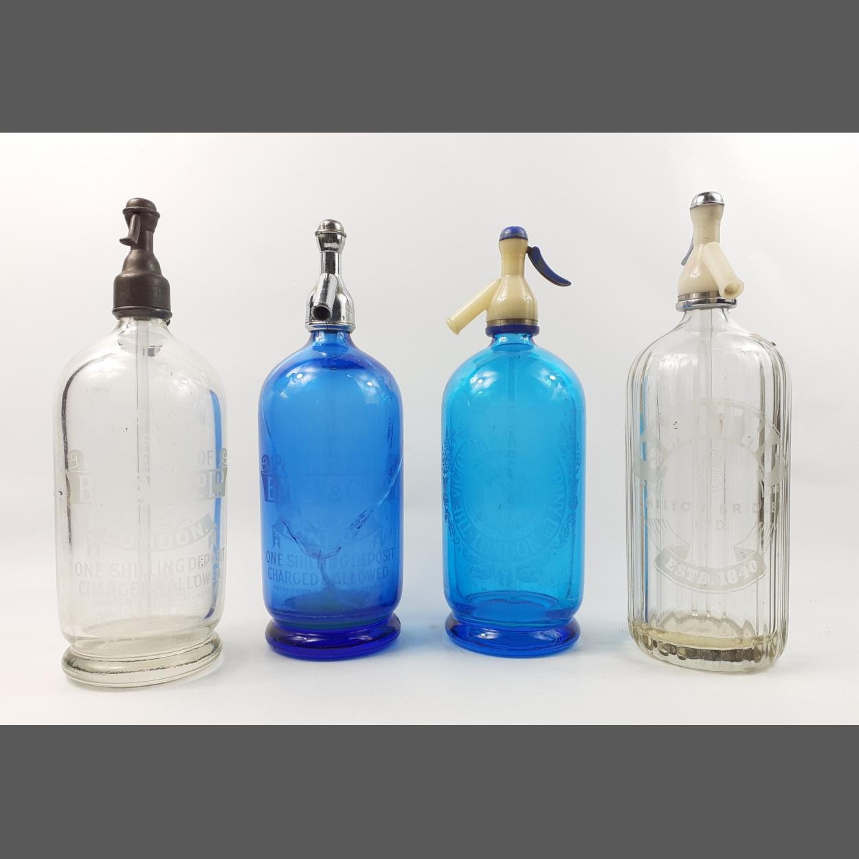 Four traditional soda syphons including VICTORIA WINE, SMITH'S of Milton Bridge, and 2 BATEY & CO. There is a crack on the inside of the blue Batey's bottle. Each offers a 1/- deposit return