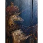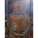 It appears on a scroll beneath the shield of the version of the coat of arms of the United Kingdom - oil on wood three panelled depiction of the Scottish coat of arms with initials W. RII and the date 1694. Frame size 75x92cm