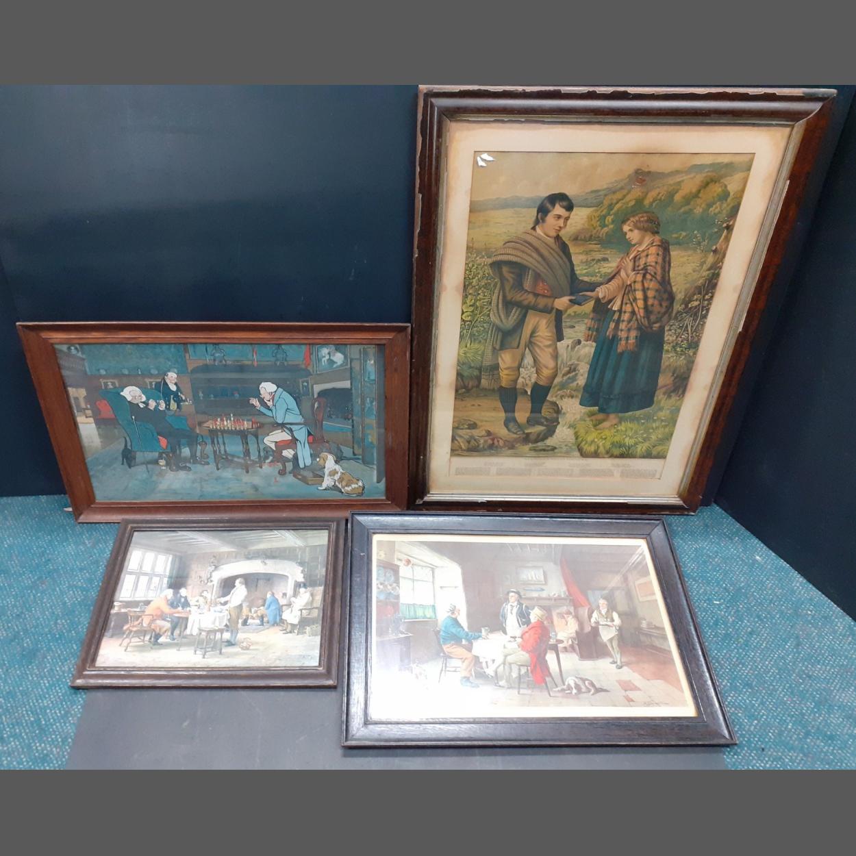 A box of mixed pictures to include Highland Mary from an old print, humorous drinking and chess scenes,