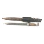A military bayonet with metal scabbard and frog in good order. Blade stamped RBD29 and marked 1636 on the blade. 41cm long.