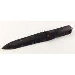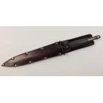 A knurled steel handled Fairbairn-Sykes fighting knife in modern leather scabbard. Lovely bluing to blade