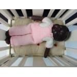 A small black doll with bisque head and cloth limbs in modern dress, standing 37cm high. Comes with vintage white wooden cot H36xW35xD25cm