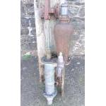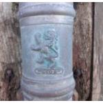 A large and imposing antique hand-pump mounted on substantial wooden board, standing 1.8m tall. Embossed lion head and LION stamp. Impressive decorative item