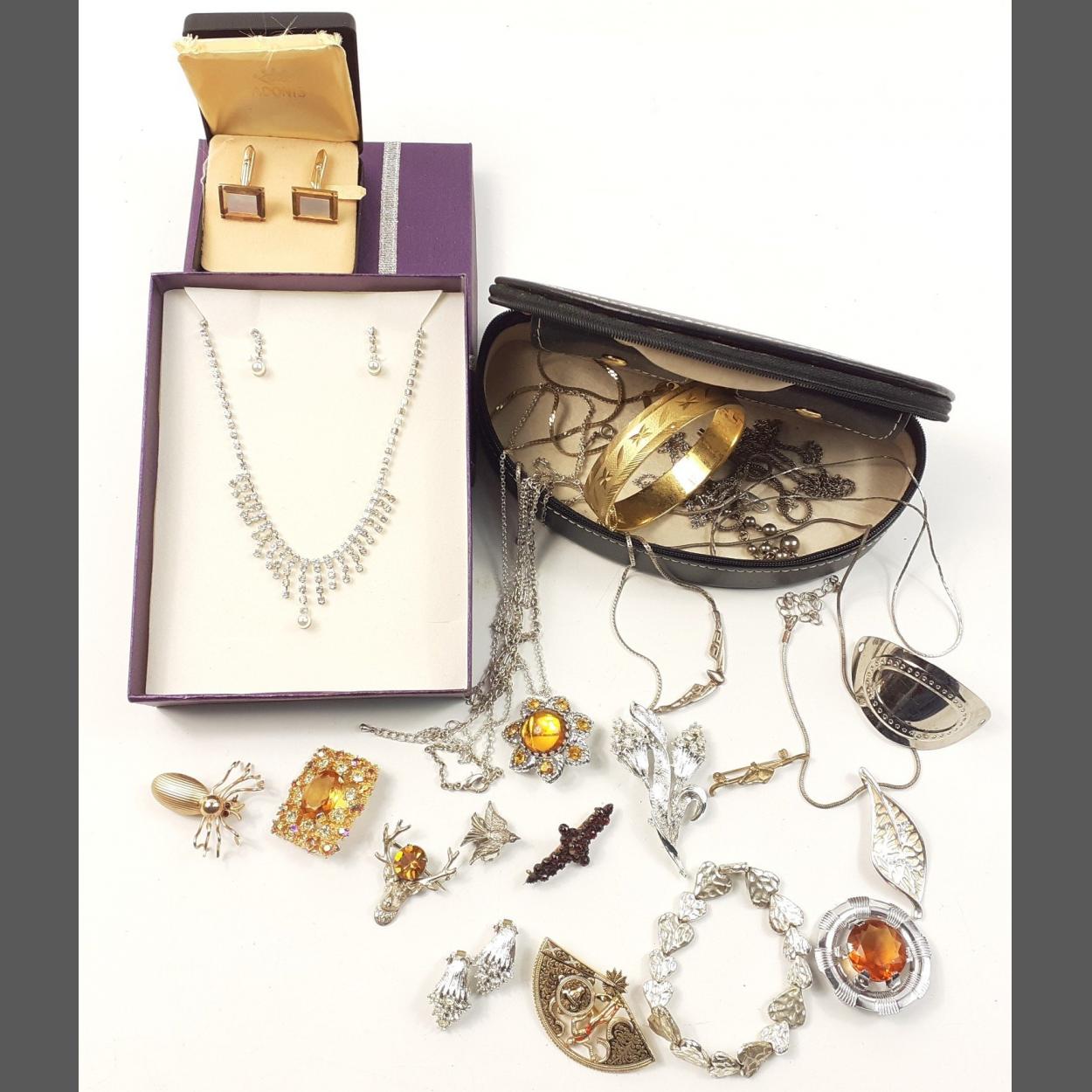 A lovely little collection of attractive costume jewellery to include stage head Scottish brooch with Cairngorm style stone, a super gilt Spider brooch, a Spanish Bullfighter fan brooch, a great heavy solid gilt bangle and much else.