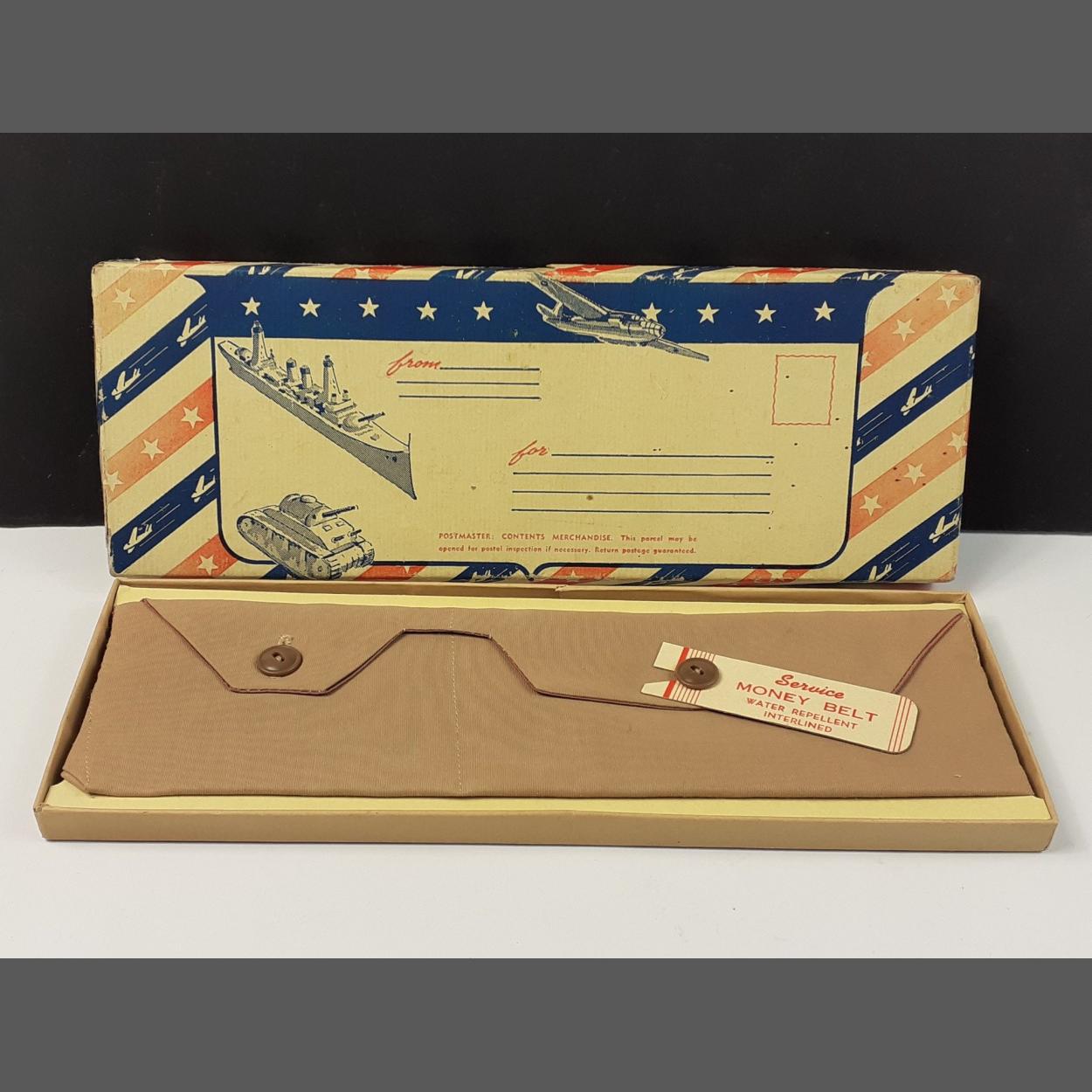 A very rare WWII era US army NAAFI boxed money belt in box with superb militaria graphics