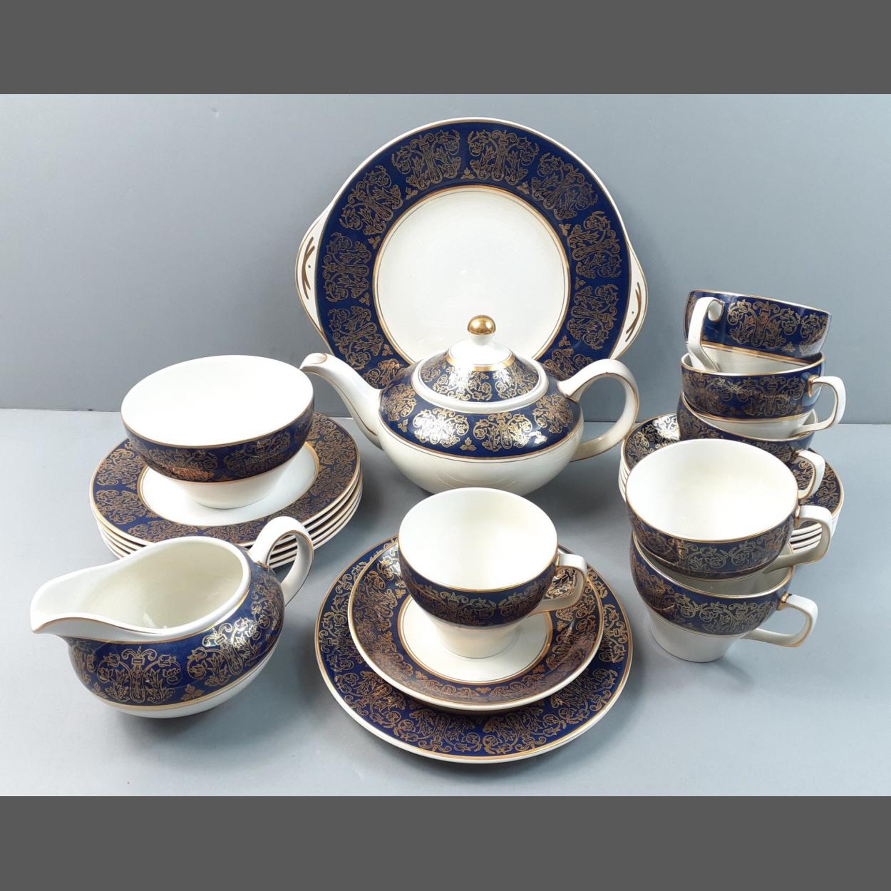 A WOOD & SONS Castile tea service in cobalt and gilt comprising 6 each of cups, saucers and side plates, 1 sandwich plate, 1 teapot, 1 cream and 1 sugar. All in good condition