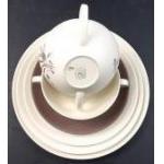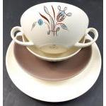 A POOLE pottery dinner service in understated floral pattern with cream background comprising 6 twin-handled soup bowls, 6 x 20cm plates, 6 x 23cm plates, 6 x 27cm plates, 3 ashets, 30cm, 36cm and 42cm, 1 lidded serving bowl (20cm dia), 1 small sauceboat, 3 saucers (18cm). All in good condition bar one tiny chip in rim of serving bowl