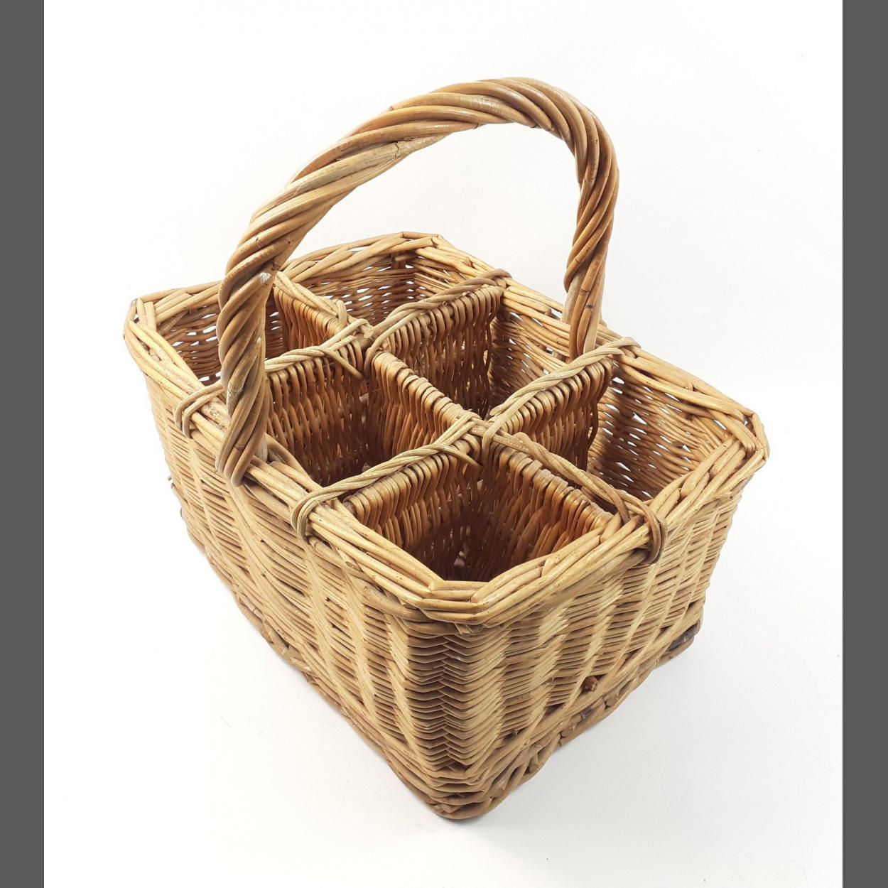 A wicker basket sectioned to carry 6 bottles in safety