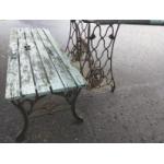 Outdoor table and bench with wooden tops. Table with Singer treadle legs and bench with iron legs. Table dimensions: W: 150cm H: 74cm D: 70cm approx. Bench dimensions: W: 123cm H: 74cm D: 70cm approx