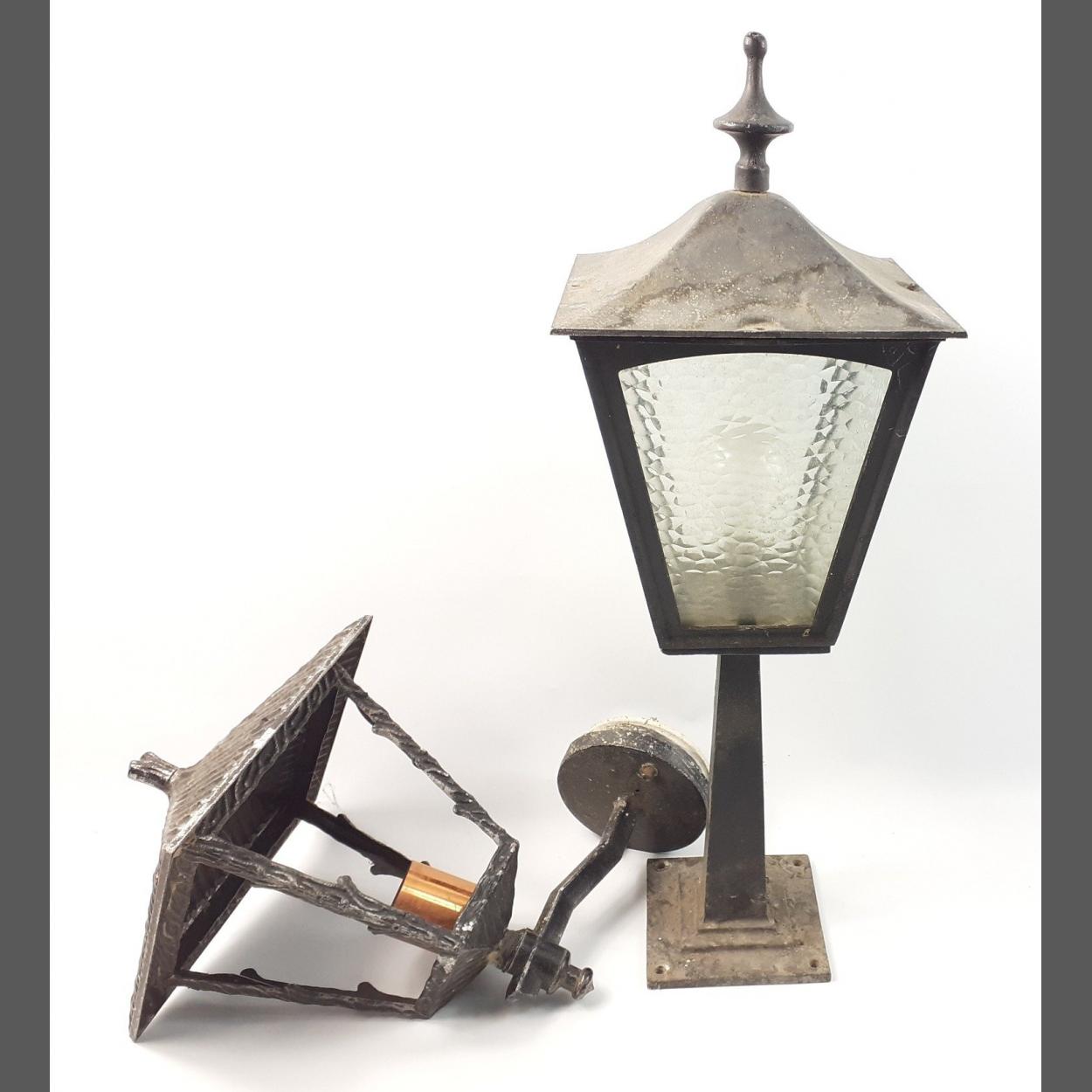 Two outdoor light fittings, one a mini Narnia lamp standing approx 60cm high, the other wall-mounted approx 38cm high. Full of rustic charm.