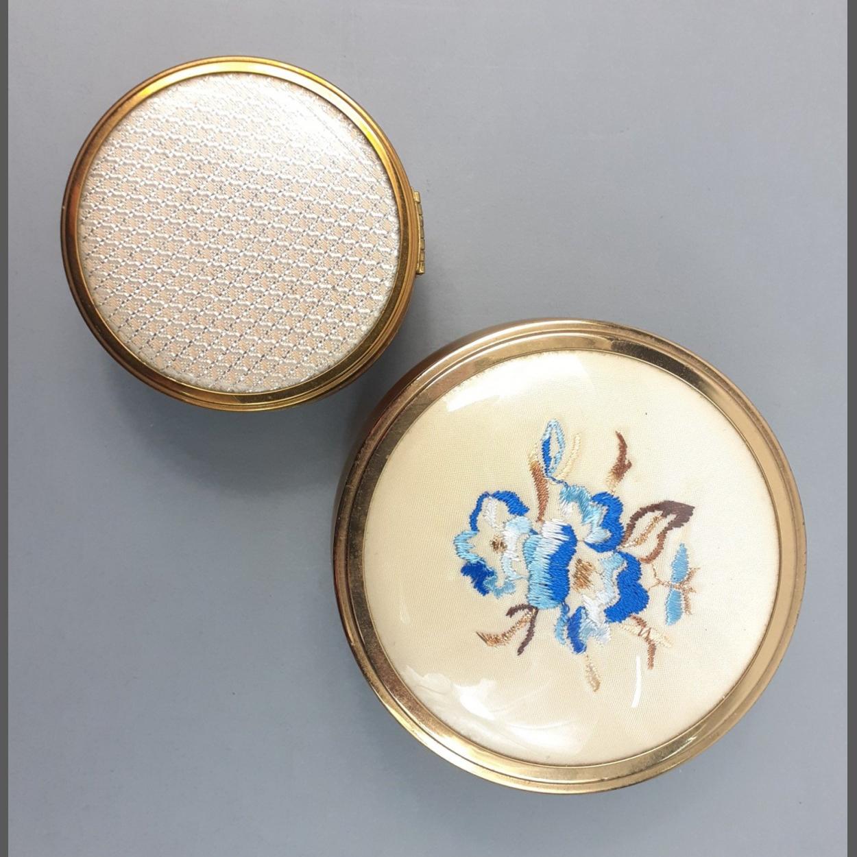 A pretty pair of round dressing table gilt boxes, the larger being 10cm approx with an appealing satin floral design to the lid. The smaller marked 'Margaret Rose'. Both pretty and useful.