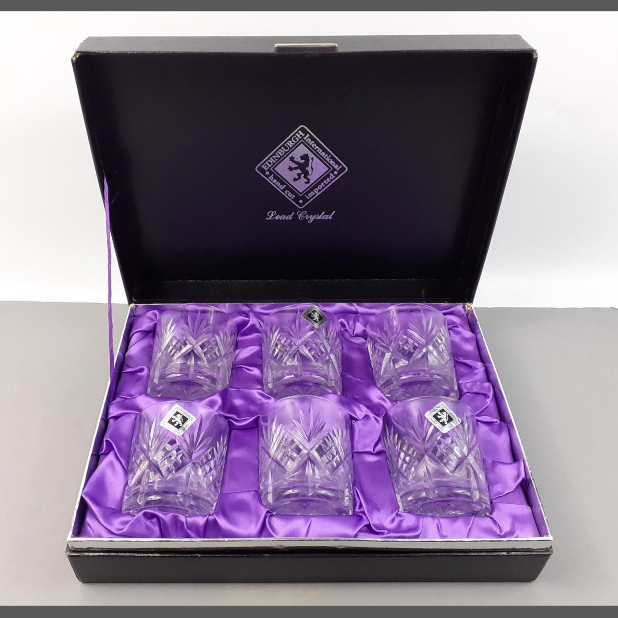 A set of 6 EDINBURGH CRYSTAL INTERNATIONAL (made in Italy) whisky tumblers cased in attractive black presentation case - starting bid £45