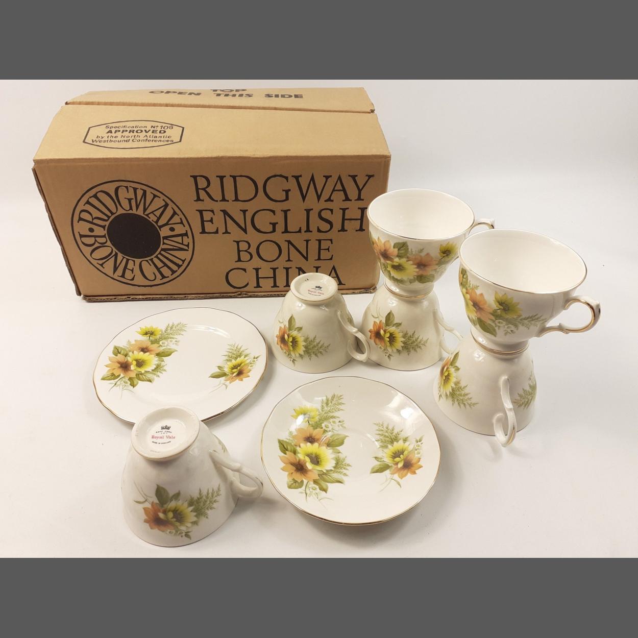 RIDGWAY ROYAL VALE tea service in box. Comprises six each of side plates, cups and saucers. A very pretty floral pattern and in good condition.