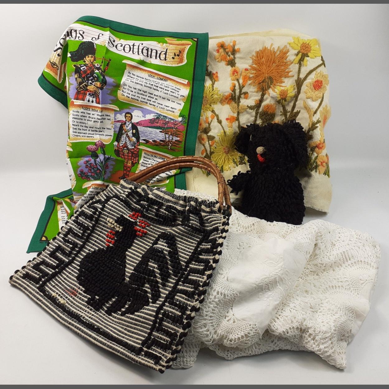 A mixed box of tableware to include a crocheted tablecloth, and other linens plus a woolwork Koala with wear