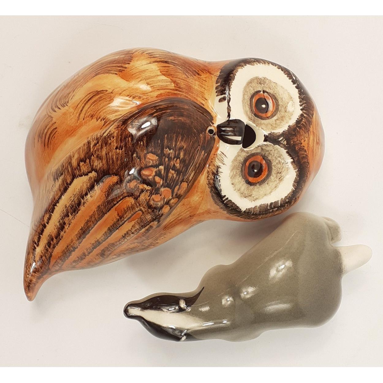 A really lovely Babbacombe Pottery wall plaque owl, likely a string holder as has a suitable space at the beak, 16cm tall. Includes a small Russian Badger ornament.