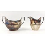 An SD NEILL silver plate teapot, a WALKER & HALL creamer and sugar bowl,1 other sugar bowl, a pair of sugar tongs reg 279186, a single-handled dish (26cm dia approx),
