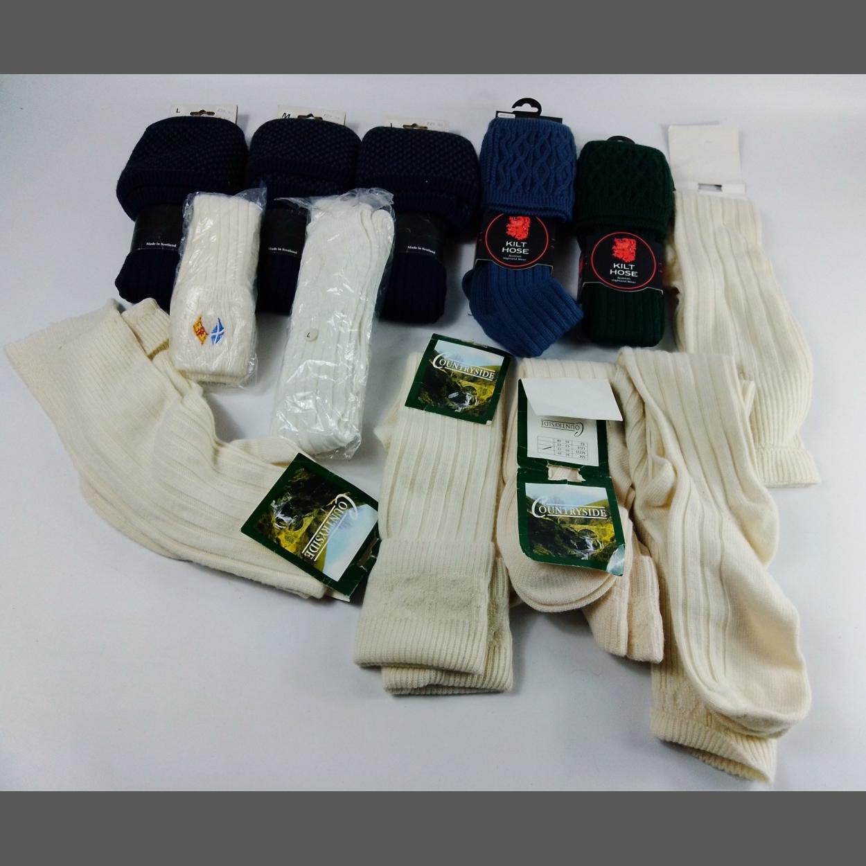 Warm socks for cold days with 4 pairs of COUNTRYSIDE kilt hose - 1 size medium (40-42) and 3 size large (43-45), 3 pairs of TAYSIDE navy blue socks (1size medium and 2 size large), 1 pair of lovat blue size 9-13 kilt hose, 1 pair of bottle green kilt hose size 6-9 plus 3 others unlabelled. All unused