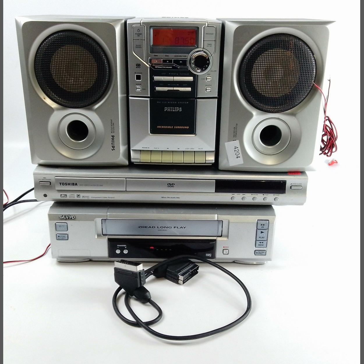 A small electronics lot to include a SANYO M292 video recorder, a TOSHIBA SD230 DVD and a PHILIPS MC110 micro music system